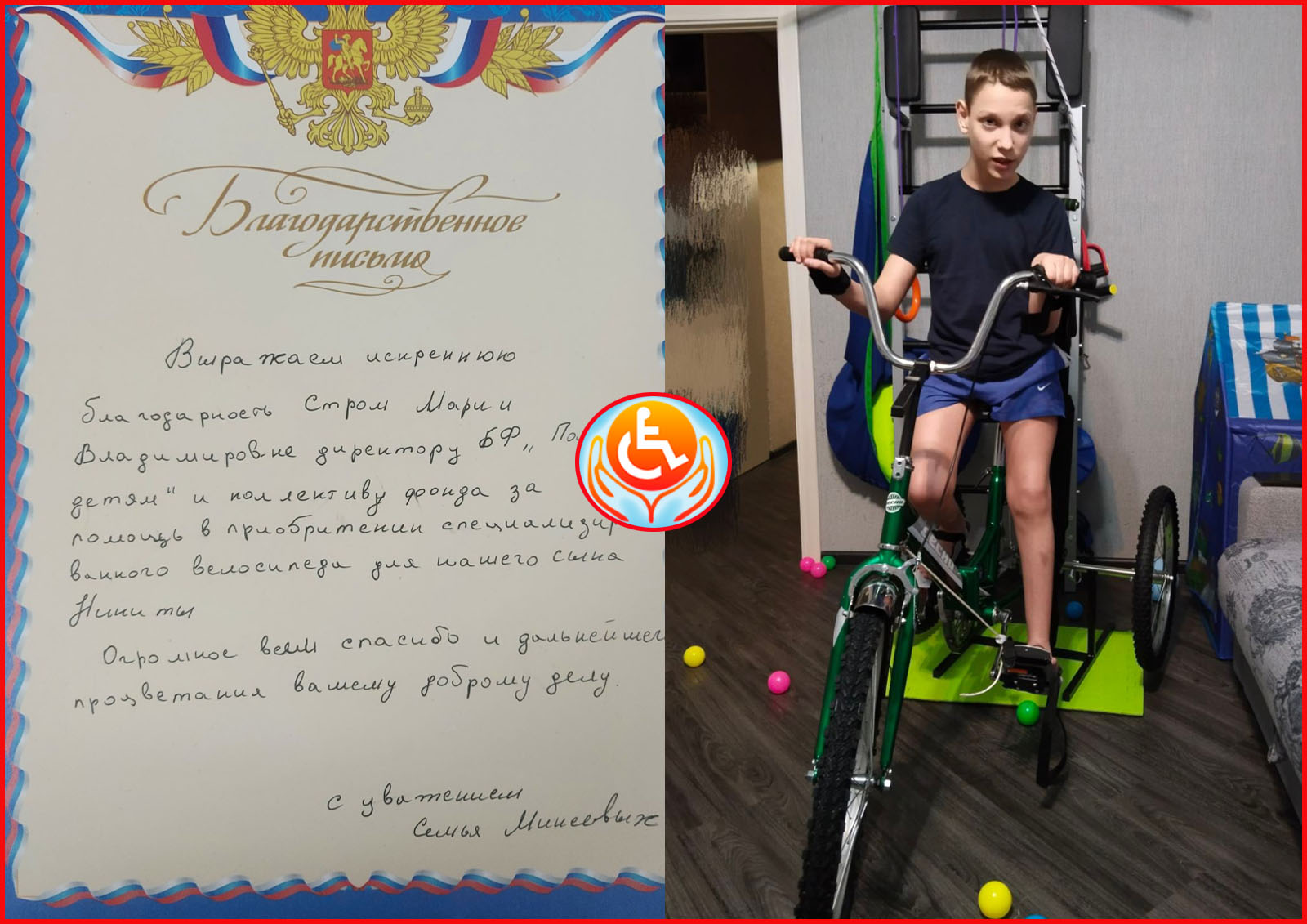 Благодаря Вашей помощи для Игоря приобретен велотренажер "Ангел -Соло" №3(С дополнительными опциями) . Велотренажер поможет Игорю совместить приятные прогулки с занятиями, улучшить координацию движений, укрепить здоровье, улучшить рефлексы, сформировать благоприятный эмоциональный фон, совершенствовать навыки ходьбы!